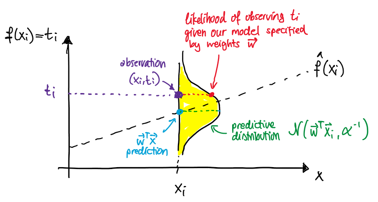 The likelihood tells us how likely it is to draw the data that we observed from the distribution \(p(t_i|\vec w, \vec x_i, D)\) for some fixed values of our model parameters \(\vec w\) (and precision \(\alpha\)).