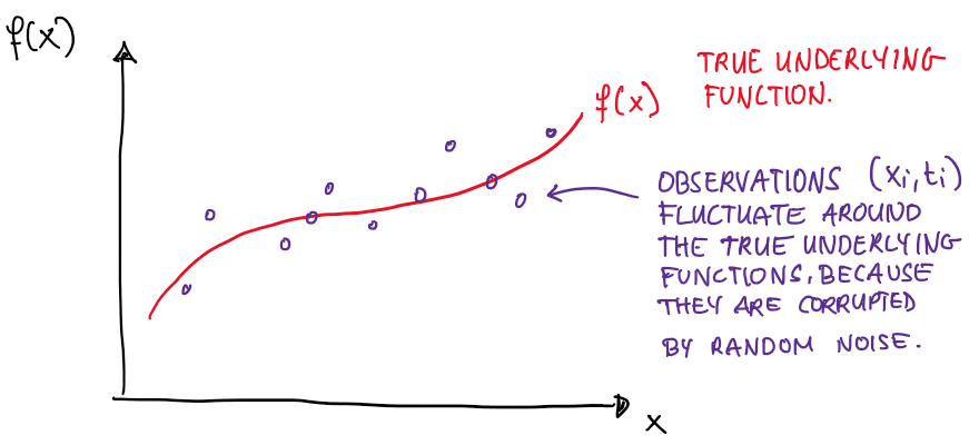 \[ t_i = f(\vec x_i) + \epsilon \qquad \text{where} \quad \epsilon \sim N(0,\alpha^{-1}) \]